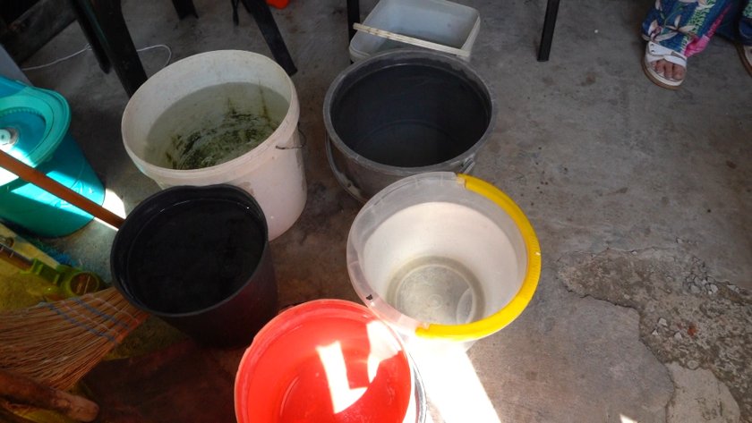 " Ето кофите, дето си сипвам вода, с цел да се окъпвам. Защото в това топло време по какъв начин може човек да не се. Ето това също е от тая сутрин- половината е празен ".