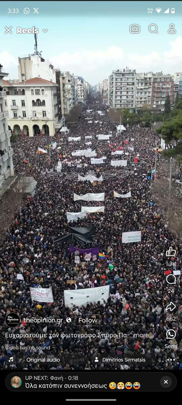 Стотици хиляди гърци излязоха по улиците в петък на втората годишнина от най-смъртоносната влакова злополука в страната и се включиха в огромни митинги и национална стачка. Протестите обгърнаха цялата страна - от остров Крит, през столицата Атина, до главните градове Солун, Кавала и др. В Атина стачкуващи хвърляха коктейли " Молотов " и подпалваха контейнери за отпадък, а полицията отговори със сълзотворен газ и водни оръдия. По неофициална информация, в стачката са се присъединили общо над 900 000 гърци във всички градове на страната - към 10% от популацията.