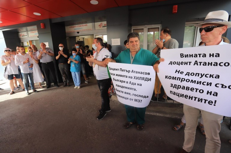 Стотици се събраха пред „ Пирогов “, с цел да поддържат началника на вътрешното поделение доцент Петър Атанасов. Причината е подредената инспекция от служебния министър на опазването на здравето доктор Стойчо Кацаров. Припомняме, че той насочи обвинявания против „ Пирогов “, че по време на пандемията са имали „ пациенти фантоми “. Лежалите в едно от най-тежките отделения в България се събраха пред „ Пирогов “, с цел да поддържат доцент Атанасов. Той излезе персонално да се види с подкрепящите го, които го посрещнаха с бурни овации.