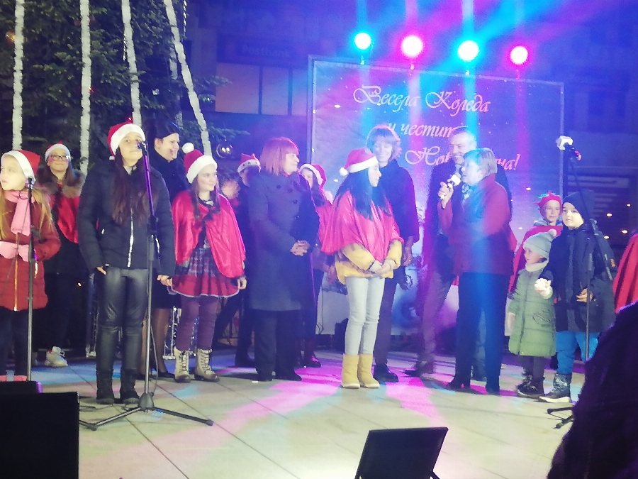 Тя предложения на сцената сътрудниците ѝ Йордан Николов и Красимира Чахова, ръководителя на общинския съвет Мария Динева и регионалния шеф Гергана Микова, които дружно да посрещнат Дядо Коледа.