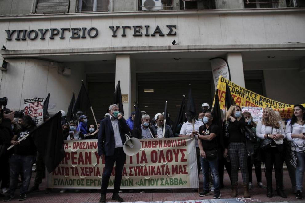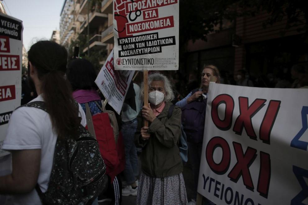 Стотици здравни служащи участваха в протестна проява в центъра на Атина , която е част от 24-часовата стачка против дефицита на личен състав и наложителната имунизация в бранша.