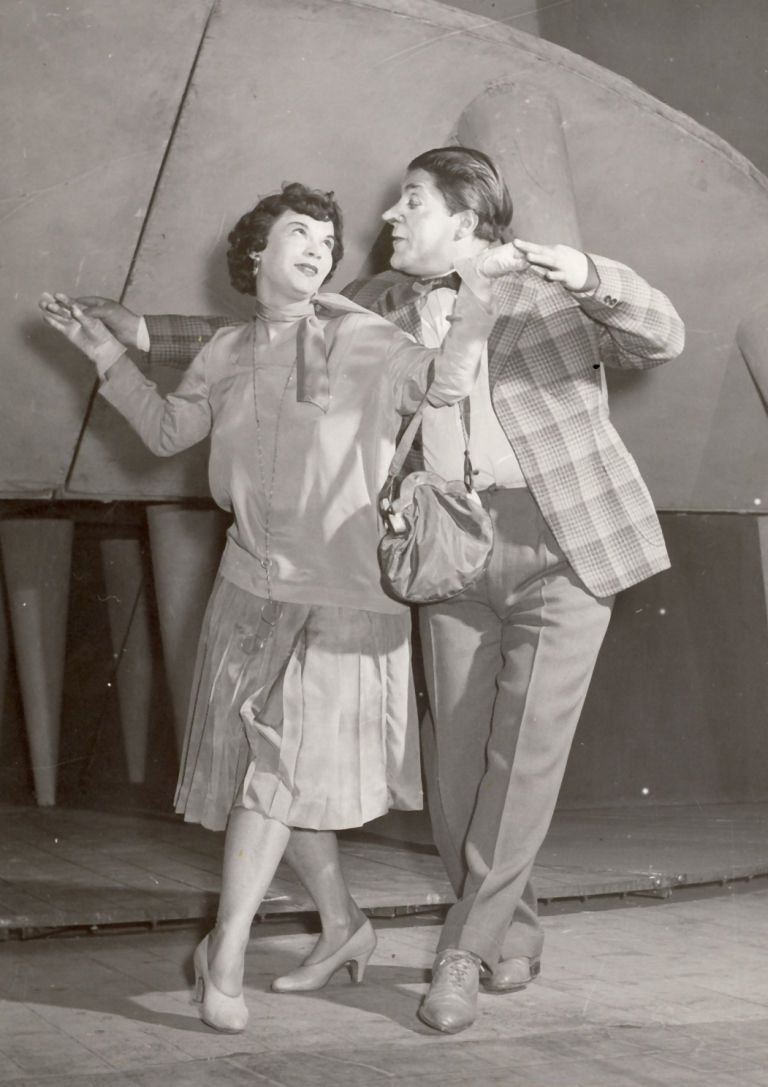 Стоянка Мутафова и Нейчо Попов в „ Баня “ на сцената на Сатиричния спектакъл (1956)