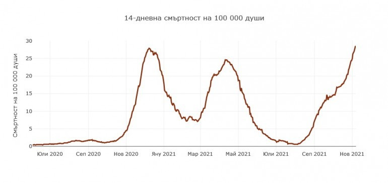Стойността е 28, 5 на 100 000 души Рекордно висока 14-дневна смъртност от началото на епидемията у нас. Стойностите демонстрират 28,5 на 100 000 души. Това сочат данните на Националния център по заразни и паразитни заболявания. Според информацията пикът е доближат на 7 ноември и е това е върхова стойност от началото на разпространяването на ковид у нас.
