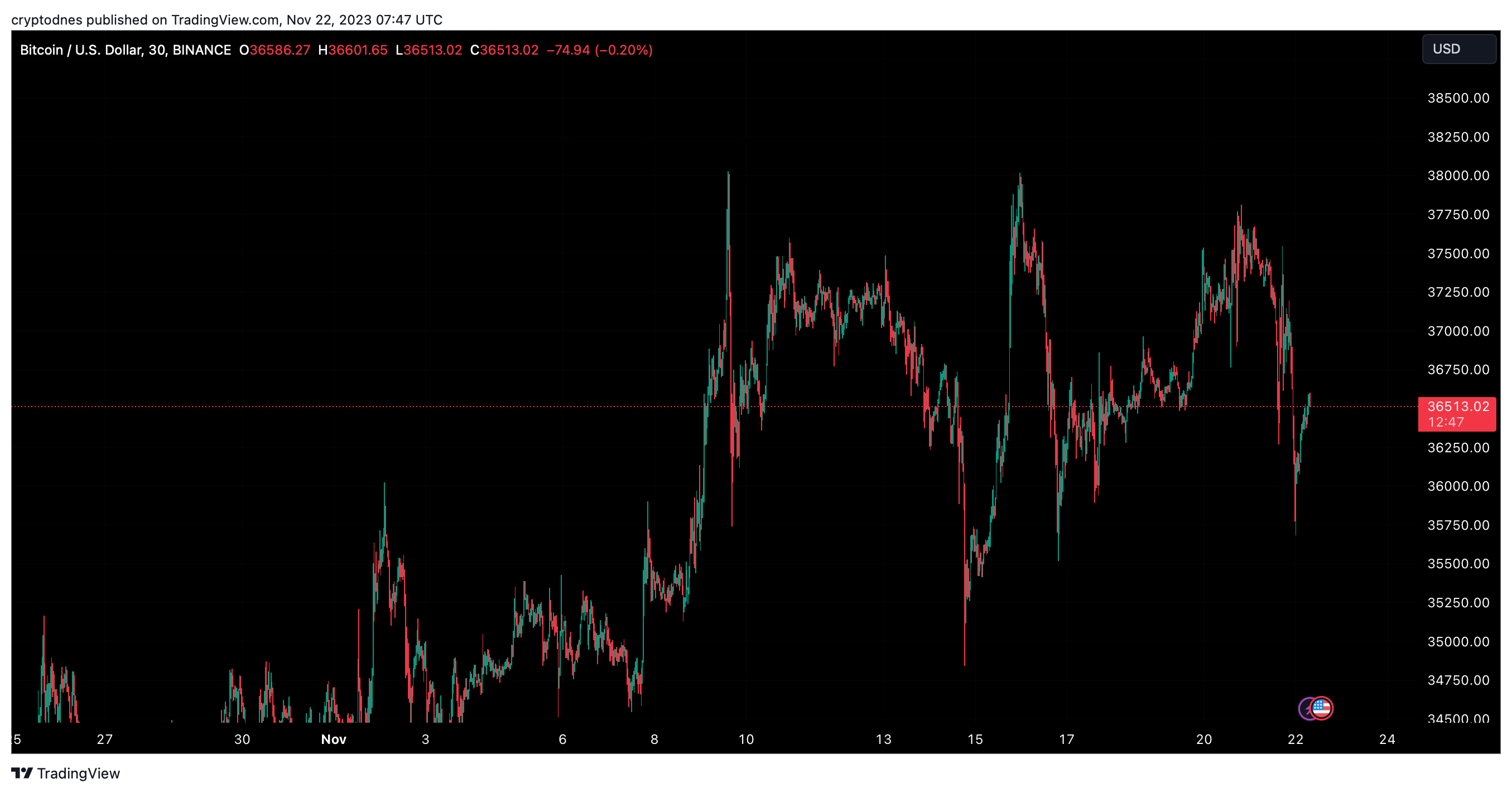 Към момента на писане на публикацията цената на Биткойн леко се е нормализирала и още веднъж се и изкачила над прага от $36,000, търгувайки се за към $36,510, което отразява спад от 2% за последните 24 часа.