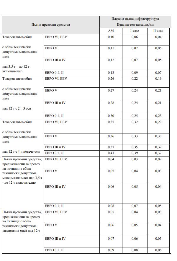 ППС над 3.5 т – 12 т ще заплащат от 4-7 стотинки на км;Автобуси до 12 т ще заплащат от 2-5 стотинки на км;Автобуси над 12 т ще заплащат 3-6 стотинки на км.