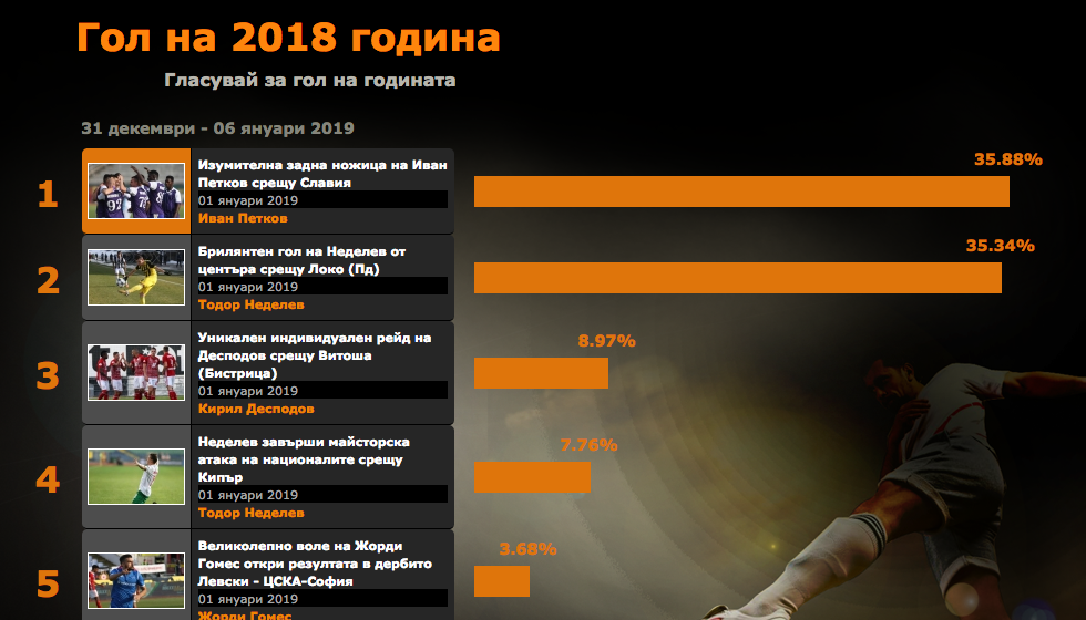 Читателите на Sportal.bg гласоподаваха за определените 11 гола от уредниците. Най-красивите осъществявания получиха близо 20 000 гласа от територията на България, като Петков събра единствено с 90 гласа повече от звездата на " канарчетата ". Футболистът на " виолетовите " приключи анкетата с 35.88%, а Неделев остана с 33.34% от гласовете. На трето място с 8.97% остана голът на Кирил Десподов в мача на ЦСКА-София против Витоша Бистрица на стадион " Българска армия”.