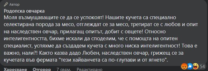 Самата страница " Родопска овчарка " към този момент е с променено изложение и към този момент е ясно, че става въпрос за " жлъч и месовъдно черен комизъм. " Много черен!