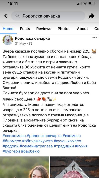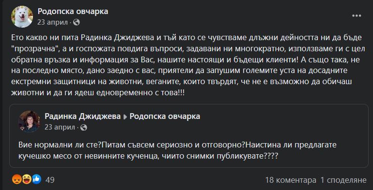 Страницата " Родопска овчарка ", която популяризира в мрежата постове, в които “предлага” кучешко месо, продължава активността си, а жители са подали тъжба до БАБХ. За това алармира Мария Кръстева до GlasNews.bg.