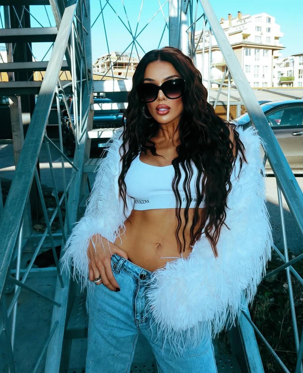 То очевидно доста топли, тъй като под него певицата е единствено по сутиен. Да не вземе да настине, че става студено.