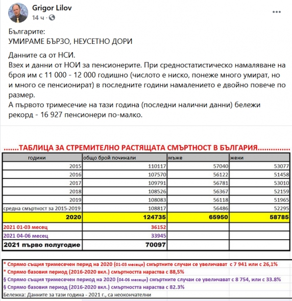 Стремително пораства смъртността в България, регистрира икономистът Григор Лилов във Facebook, като се базира на данни на Национален статистически институт.