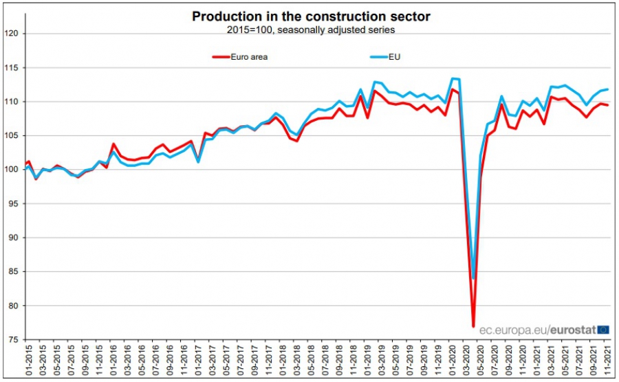 Строителната продукция у нас нараства с 3.2% на годишна база през месец ноември предходната година, сочат сезонно изгладените данни на европейската статистическа работа Евростат. Това е над междинното равнище на напредък за Европейския съюз, което възлиза на 1.3% към края на единадесетия месец на 2021 година.Конкретно за страните от еврозоната, строителната продукция бележи годишен растеж от 0.5%.