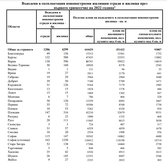 По предварителни данни на Националния статистически институт броят на въведените в употреба жилищни здания в България през първото тримесечие на 2022 година е 1206, а новопостроените жилища в тях са 4299. Спрямо първото тримесечие на 2021 година постройките са с 254 повече, или с 26.7%, а жилищата в тях понижават едвам с към 4%.