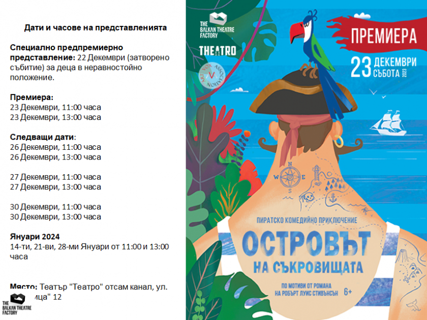 Премиерните спектакли на " Островът на съкровищата " са на 23 декември от 11:00 и 13:00 часа, оповестиха от Art Vox.