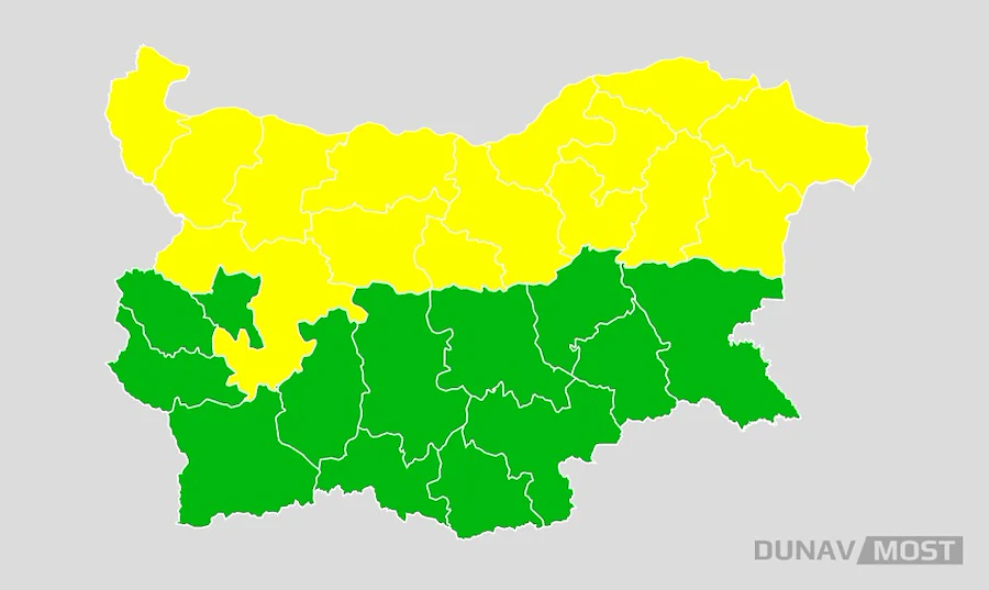 Предупредителният код е в действие за областите: Русе, Видин, Монтана, Враца, Плевен, Ловеч, Габрово, Велико Търново, Търговище, Разград, Силистра, Шумен, Добрич и Варна.