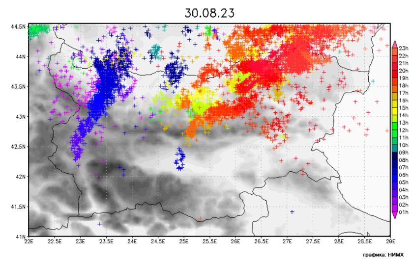 Близо 16 000 мълнии са паднали през вчерашния ден на територията на цяла България, демонстрира карта на Национален институт по метеорология и хидрология, съобщи Българска национална телевизия. Само в региона на Русе, в радиус от 20 км, са били регистрирани 276 мълнии.