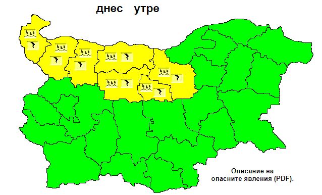 По-значителни и на повече места ще са явленията в северната половина от страната. Там е разгласен жълт код за гръмотевични стихии и превалявания в 7 области – Видинска, Монтанска, Врачанска, Плевенска, Ловешка, Габровска и Великотърновска. Ще има краткотрайни, краткотрайно интензивни превалявания и гръмотевици, по-значителни в южните региони на региона. Има условия за градушки. Количествата на преваляванията ще са към 20-35 мм.