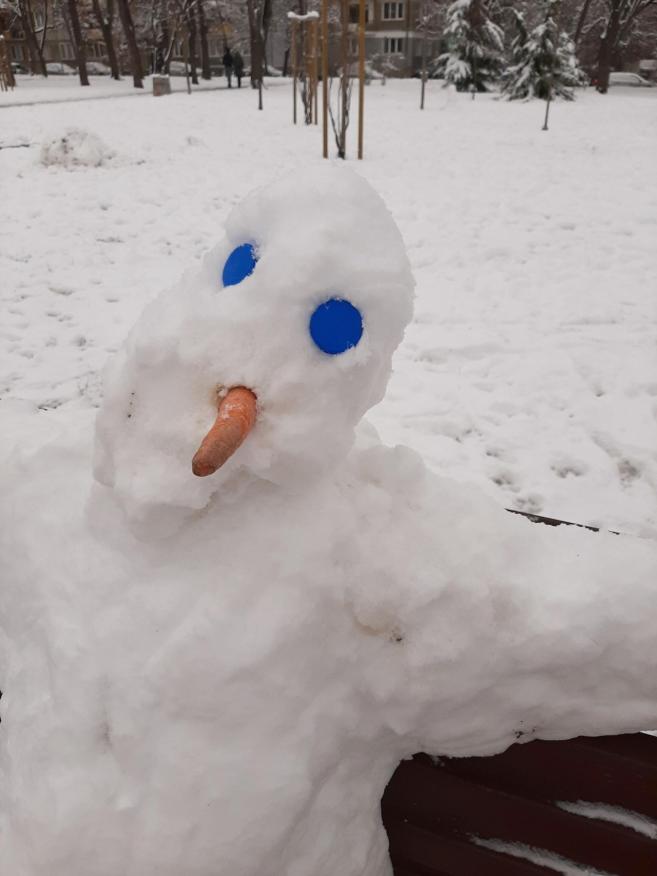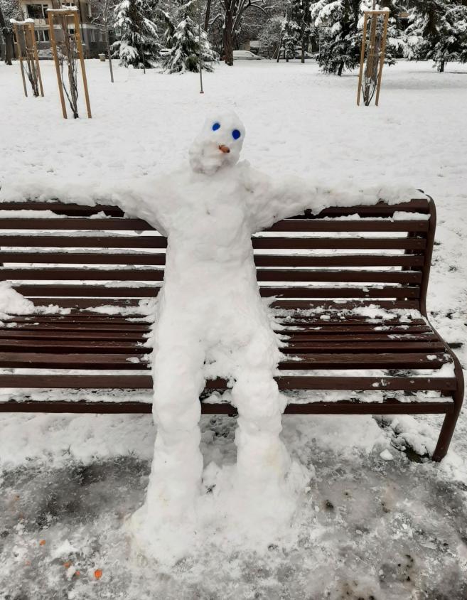 Децата в София също не останаха по-назад – на една скамейка в покрит със сняг столичен парк в този момент се обляга снежен човек в реален размер, с огромни сини очи, основан с доста въображение и усърдие.