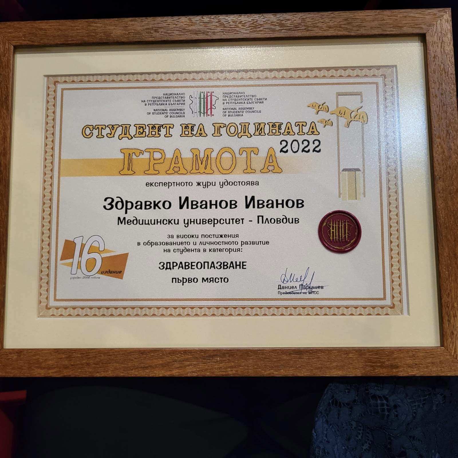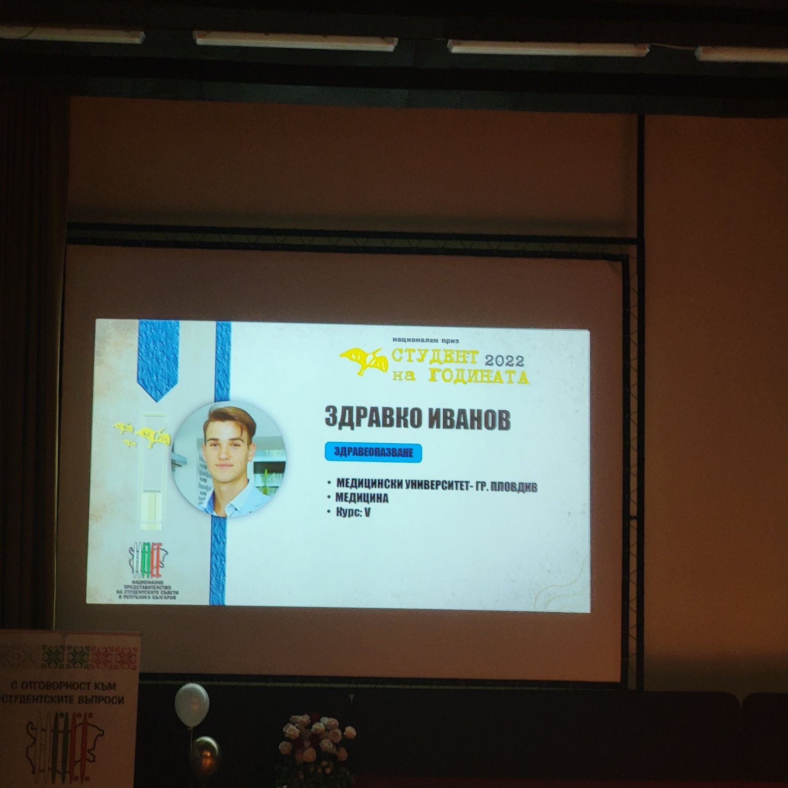 Студентът по медицина от пети курс на Медицински университет-Пловдив Здравко Иванов получи наградата " Студент на годината ".