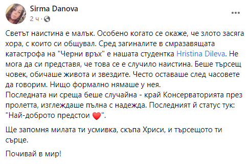 " Светът в действителност е дребен. Особено когато се окаже, че злото визира хора, с които си общувал. Сред починалите в смразавящата злополука на " Черни връх " е нашата студентка Христина Дилева. Не мога да си показва, че това се е случило в действителност. Беше търсещ човек, обичаше живота и звездите. Често оставаше след часовете да приказваме. Нищо официално нямаше у нея.
