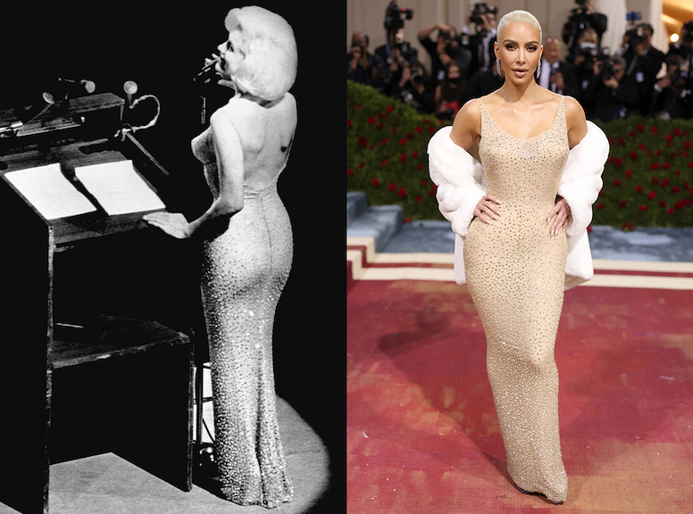 Тя остава най-скъпата рокля, продадена на търг, до момента. А неин основател беше обичаният фешън дизайнер на актрисата Жан Луи, който нееднократно ставаше „ провинен “ на най-хубавите й изяви. И напълно неотдавна Ким Кардашиян избра тъкмо тази „ гола “ рокля като облекло за събитието Met Gala Costume Institute. Според Кардашиян, за нея Мерилин е знак на американския дух, тъкмо в точния момент за тематиката на бала. Културната светиня обаче донесе на Ким единствено проблеми.