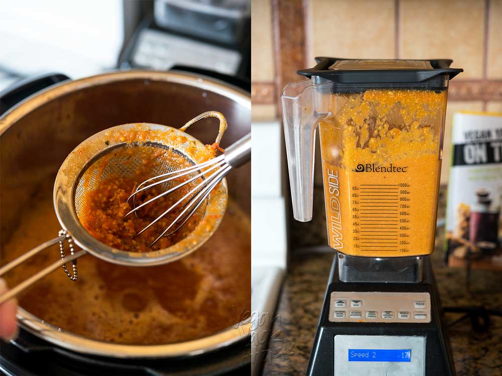 - След като сте прецедили и махнали семчиците на домата, прехвърлете гладката доматена основа назад в блендера, прибавете кашуто, захарта и солта. Блендирайте, до момента в който стане съвсем безпрепятствено, оставете да престои 5 минути, след което пасирайте още веднъж, до момента в който стане изцяло безпрепятствено, като добавите още подправки- по ваше предпочитание.