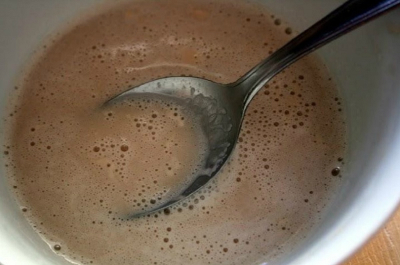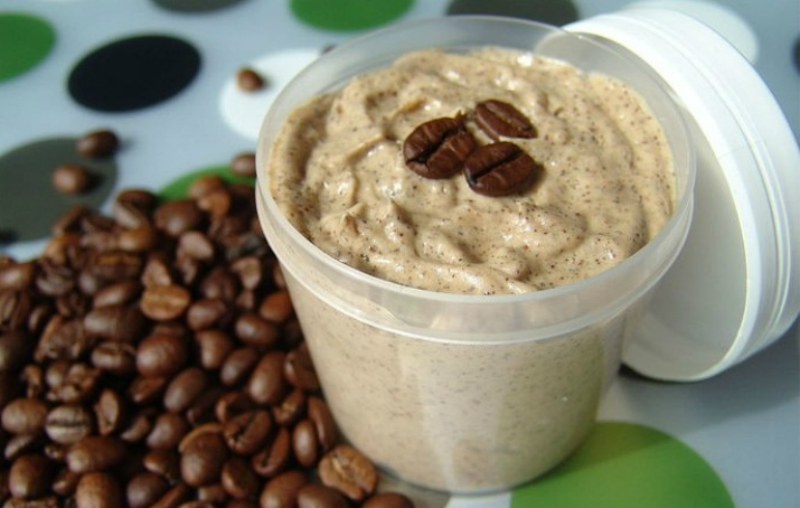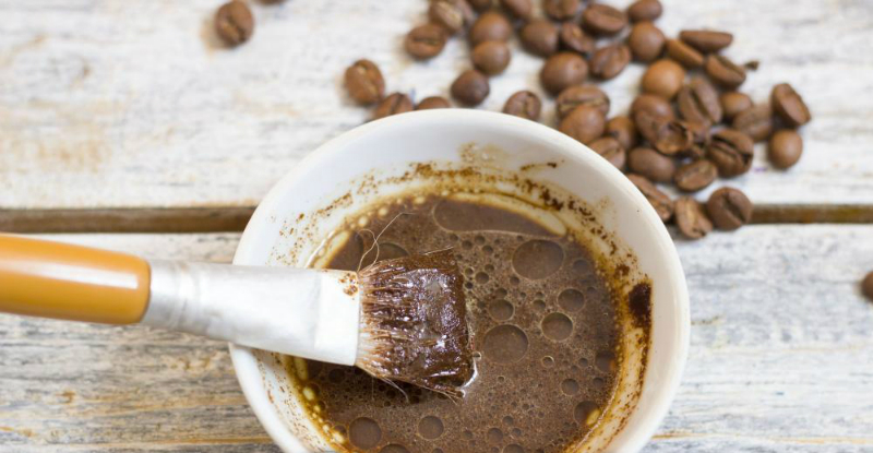 Разтворете кафето във вода, с цел да разтворите всички гранули. Добавете получената каша към киселото мляко. Добавете етерични масла, разбъркайте. Нанесете сместа върху скалпа и косата, масажирайте.