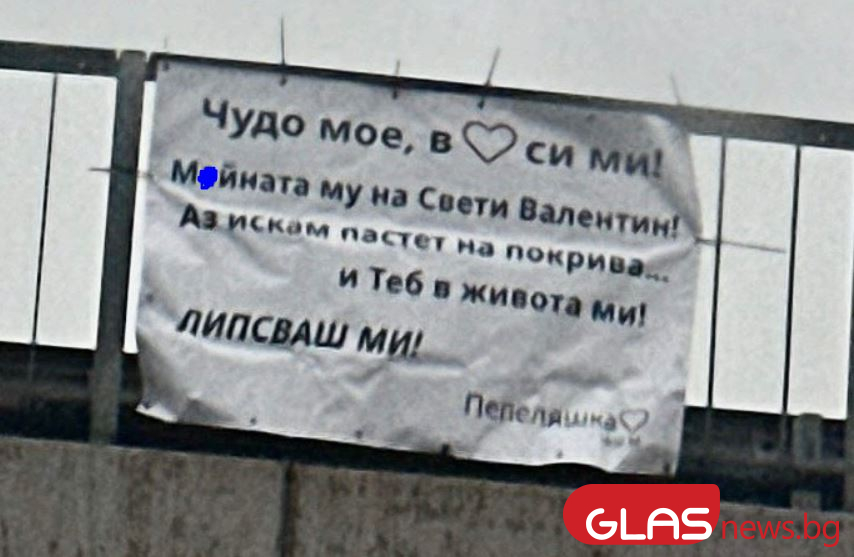 Свети Валентин може и да е мина, само че за изразяването на любовта не е необходим календар. Доказателство за това се появи на едно от натоварените софийски кръстовища. Огромен транспарант с извънредно любовно обръщение е закачен при кръговото придвижване за " Драгалевци ", по пътя от " Студентски град към " Люлин ", и притегли вниманието на столичани. За това описа читателка на GlasNews.