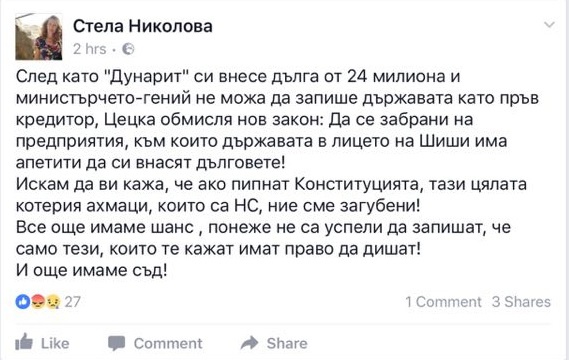 В свое публично писмо Съветът на шефовете на " Дунарит " показва, че заводът е платил на Държавната консолидационна компания (ДКК) предварително, като благодари на министъра на стопанската система Емил Караниколов, който съумял да обезпечи изкупуване на задълженията на " Дунарит " и те са отишли в ДКК. По този мотив във Фейсбук юрист Стела Николова иронично разяснява, че откакто с изплащането на дълга " Дунарит " не е разрешил страната да стане пръв заемодател на предприятието, правосъдният министър Цецка Цачева обмисля нов закон, с който да забрани на компании и компании, които са " забавни " на депутата от Движение за права и свободи Делян Пеевски, да си заплащат задълженията.