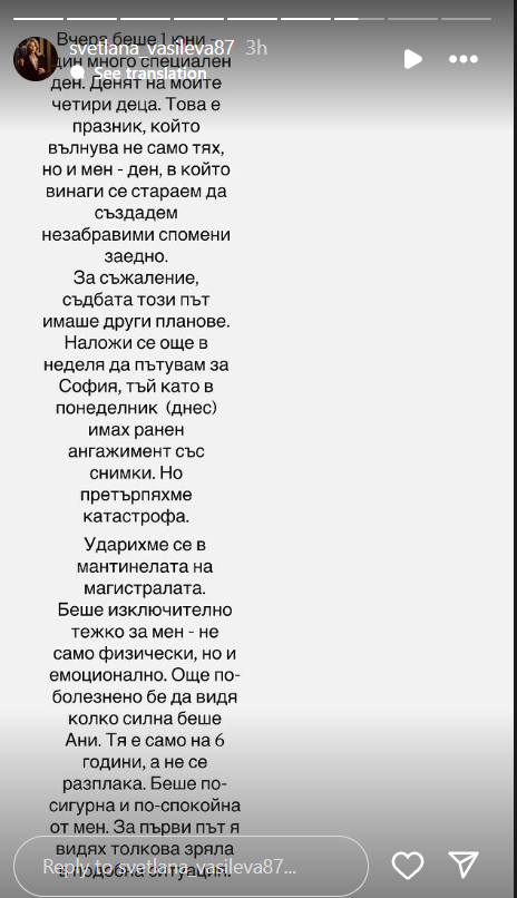 „ Вчера беше 1 юни - един доста специфичен ден. Денят на моите четири деца. Това е празник, който вълнува освен тях, само че и мен - ден, в който постоянно се стараем да създадем незабравими мемоари дружно. За страдание, ориста този път имаше други проекти. Наложи се още в неделя да пътувам за София, защото в понеделник имах ранен ангажимент със фотоси. Но претърпяхме злополука. Ударихме се в мантинелата на автомагистралата “, показа някогашната госпожа Гущерова.