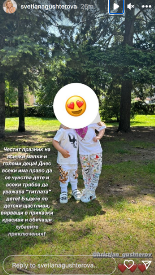 Светлана Гущерова реши да покаже трите си деца, а мотивът бе 1 юни, видя Lupa.bg. Кланът Гущерови отпразнува Деня на детето с домашно празненство. Бившата еротична моделка качи няколко фотоси на отрочетата си, само че им скри лицата. Мъжът й Християн също побърза да препостне сторитата на брачната половинка си, която е в напреднала бременност и чака правоприемник №4.