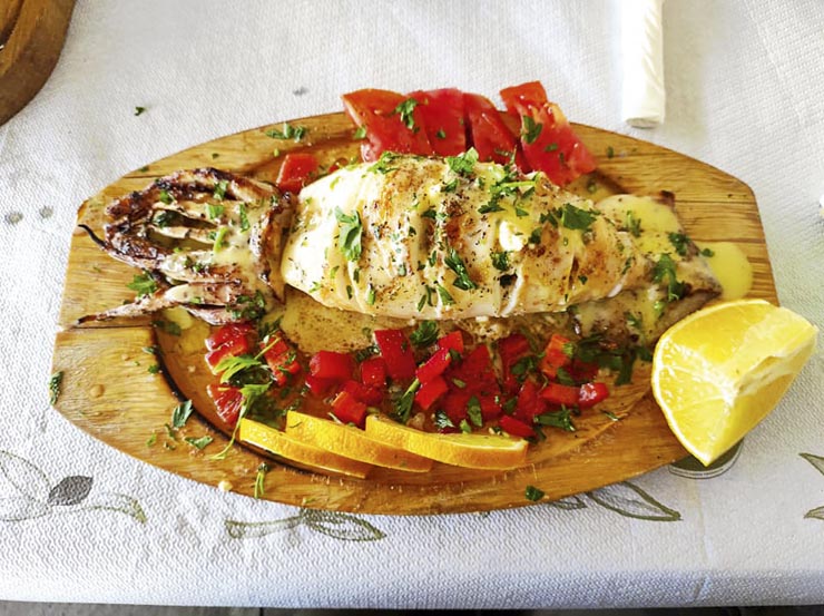 Първо имахме салата от розови домати, пресносолно домашно овче сирене, гриловани маслини и... саликорния, наричана още морска аспержа, ужасно вкусно. Никога не бях ял саликорния в България, Лъчо внася по няколко кг за ресторанта си. Почерпи ни домашна смокинова ракия, преди да стартираме с виновността. Еликсир.След това имахме домакински тарама хайвер с пушена сьомга и дайкон, които просто го изстрелват в друга галактика, кьопоолу, млечна салата, калмари от специфичен тип, пържен сафрид, печен кашкавал, скариди но Хиос и... Том Ям – тайландската чорба, която Лъчо прави божествено. Той и шкембе от октопод прави, само че в понеделник пресният улов не беше още дошъл.