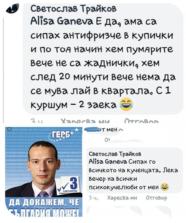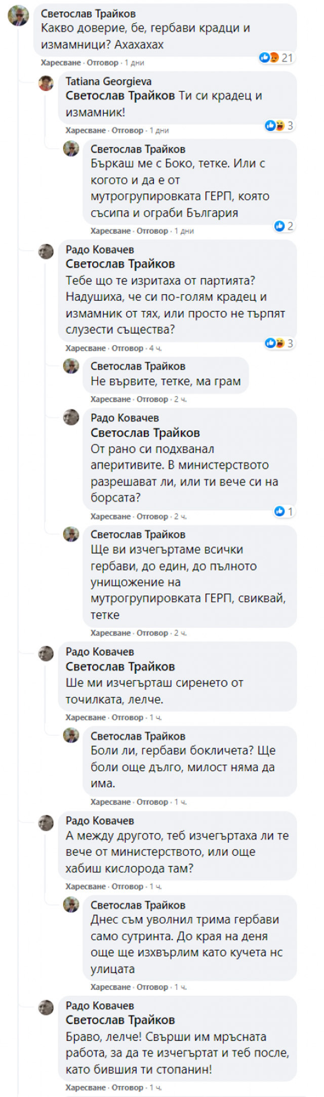 Светослав Трайков, назначеният от Велислав Минеков като консултант в Министерство на културата, продължава да залива със закани и обиди обществените мрежи. Последно той се демонстрира интензивно под обява на депутата от ГЕРБ Екатерина Захариева.