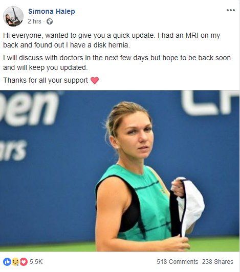 Световната номер 1 в женския тенис Симона Халеп има дискова херния. Това призна самата румънка, която се обърна към последователите си посредством формалния си профил в обществената мрежа Facebook.