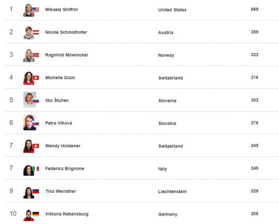 В класирането за огромния бистър глобус Микаела Шифрин води с 689 точки пред Никол Шмидхофер с 359 и Мовинкел с 322.
