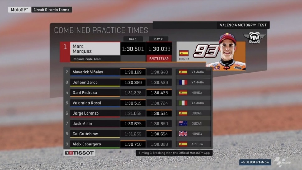 Световният първенец в MotoGP за 2017-а Марк Маркес оглави втория и финален ден от първия формален предсезонен тест в шампионата във Валенсия. Испанецът излезе на първата позиция в следобедните часове, а в последния час реализира обиколка за 1:30.033 минути на " Рикардо Тормо " – с 0.156 секунди по-добра от вчерашната на Винялес.