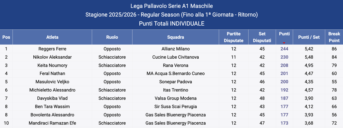 Лидер е белгиецът от Алианц (Милано) Фере Регерс с 244 точки и мач повече.