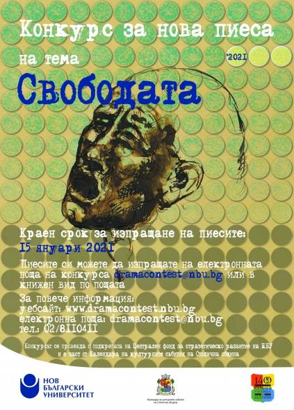 Свободата е тематиката на петото юбилейно издание на Конкурса за нова пиеса 2021 на Нов български университет. С нея уредниците му се надяват да предизвикат драматурзите, пишещи на български език, към отключването на забавни сюжети, истории, фигури, към основаването на текстове за спектакъл с нова и по-свободна форма.