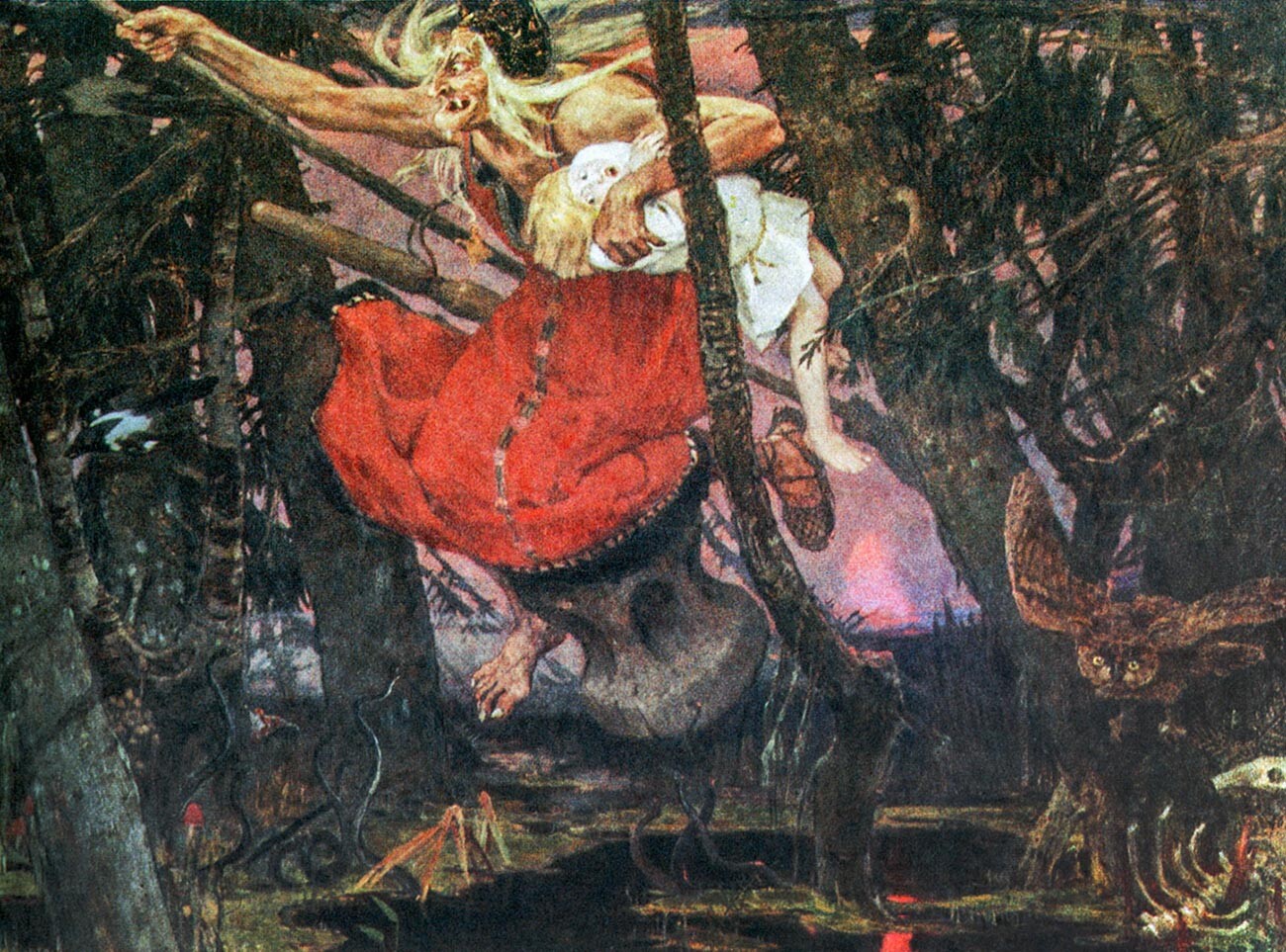 С Баба Яга и до ден-днешен плашат съветските деца. Тази остаряла магьосница живее в гората в барака на кокоши крайници и лети в хаван. Мащехата изпраща ненавижданата си доведена щерка при Баба Яга като слугинче. Злата бабичка кара момичето да работи, само че се оказва, че желае да я изяде! Момичето замисля бягство и горски животни, че даже и неодушевени предмети ѝ оказват помощ, тъй като е блага и привързана към всички. Бащата, като научава, че жена му праща момичето на сигурна гибел, доста се ядосал и я изгонил.