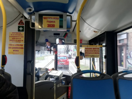 Докато с табелка водачът честити Новата година на пасажерите си, им напомня, че местата най-отпред са предопределени за майките с дребни деца, които би трябвало да ценим и почитаме.