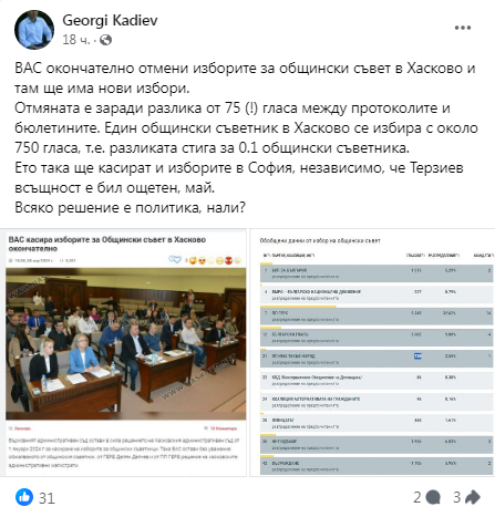 Отмяната е поради разлика от 75 (!) гласа сред протоколите и бюлетините. Един общински консултант в Хасково се избира с към 750 гласа, т.е. разликата стига за 0.1 общински съветника.