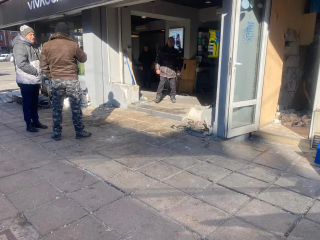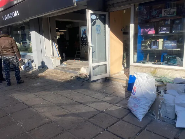 Автомобилът в офис на мобилен оператор и е разрушило и стената от вътрешната страна към прилежащия магазин.