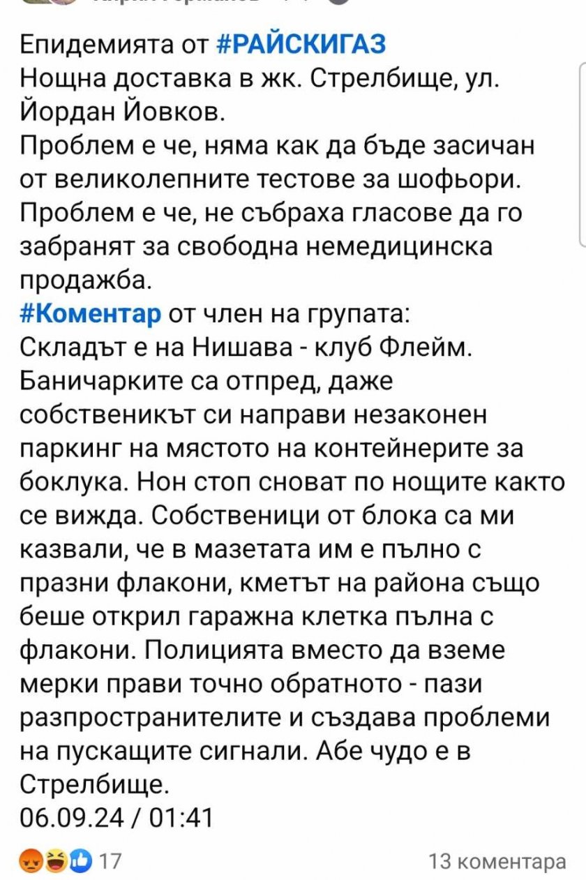 " Нощна доставка в жк. Стрелбище, ул. Йордан Йовков. Проблем е че, няма по какъв начин да бъде засичан от превъзходните проби за водачи. Проблем е че, не събраха гласове да го забранят за свободна немедицинска продажба. #Коментар от член на групата: Складът е на Нишава - клуб Флейм. Баничарките са начело, дори притежателят си направи противозаконен паркинг на мястото на контейнерите за боклука. Нон стоп сноват по нощите както се вижда. Собственици от блока са ми казвали, че в мазетата им е цялостно с празни флакони, кметът на региона също беше разкрил гаражна клетка цялостна с флакони. Полицията вместо да вземе ограничения прави тъкмо противоположното - пази разпространителите и основава проблеми на пускащите сигнали. Абе знамение е в Стрелбище. 06.09.24 / 01:41 " - пишат поданици на квартала в обществените мрежи.