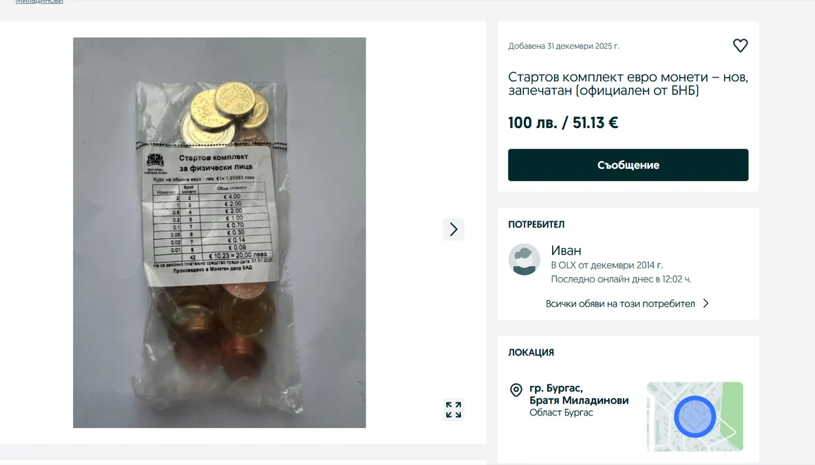 Ден откакто България публично стана 21-вата членка на еврозоната, спекулата със " стартовите пакети " евромонети доближи неуместни измерения. Търговци в платформите за онлайн разгласи продават найлоновото пликче с монети, чиято номинална стойност е 10.23 евро (20 лева), за сумата от 100 лв..