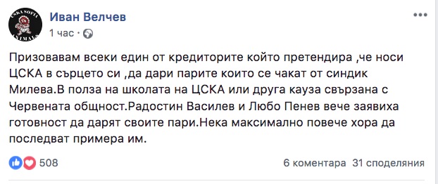 Чрез страницата си във “Фейсбук” той прикани всички кредитори, които чакат пари от синдик Дора Милева и настояват, че носят ЦСКА в сърцето си, да дарят сумата в интерес на ДЮШ или за друга идея, обвързвана с алената общественост.
