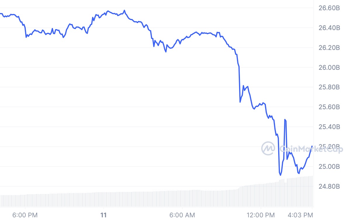 За да осигурим прочут подтекст, пазарната капитализация на XRP възлизаше на $26.58 милиарда преди седем дни, по-точно на 4 септември. По последни данни, получени от CoinMarketCap на 11 септември, обаче тя е намаляла до $25.1 милиарда, което демонстрира забележителна загуба от почти $1.5 милиарда през този интервал.