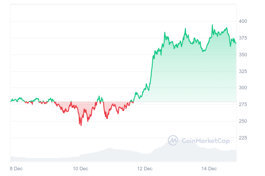 AAVE , DeFi токен, означи растеж на цената си от 31%, подхранван от акумулирането на китове и известията за интерес от страна на крипто план, обвързван с Тръмп. „ “ посочва мощен бичи подтик, което допуска допустимо рали към $440. Все отново прибирането на облаги от страна на притежателите може да ограничи облагите, понижавайки цената до $309.42.