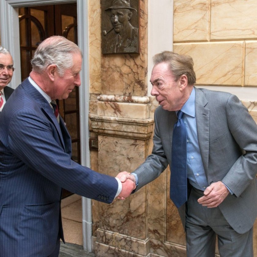 Крал Чарлз III поздравява композитора Андрю Лойд Уебър
