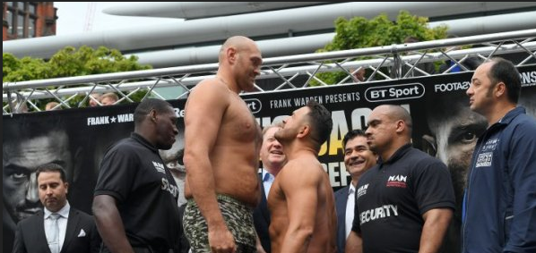 Tyson Fury weighs in at 19st 10lb ahead of his comeback fight against Sefer Seferi - and in case the 65 lb difference wasn't immediately clear, Tyson_Fury promptly scooped the Albanian up like a baby pasport pic.twitter.com/ymYMOjGGD4