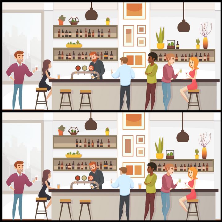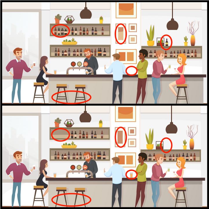 1. Четири бутилки липсват от горния рафт. 2. Бар столовете са с отстранени поставки за крайници. 3. Картината е заменена. 4. Мъжът в зелено е получил бира. 5. Бутилката от горната страна на десния рафт липсва.