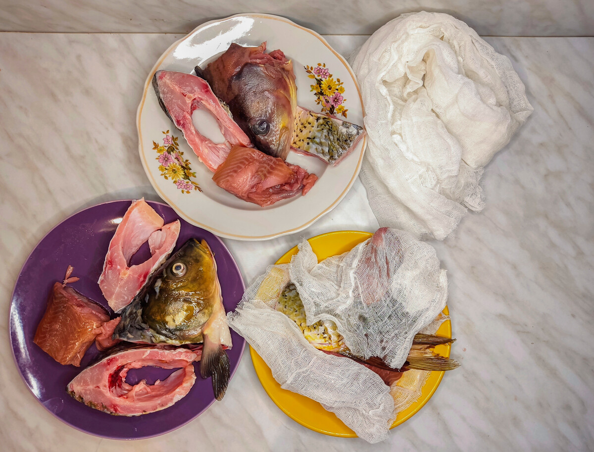 Ще стартираме с тройната уха. За да извършите това, дано вземем шаран и костур (или вземете други типове риба, които нормално употребявате за рибена супа). Изкормете и почистете добре рибата, като не забравяйте да премахнете хрилете. След това разделете рибата на три елементи. Една част увийте в марля под формата на торбичка.